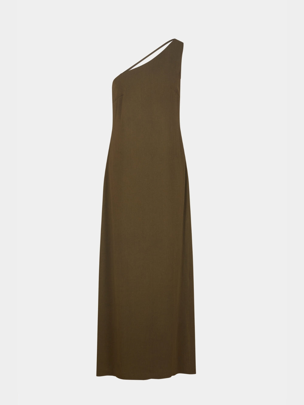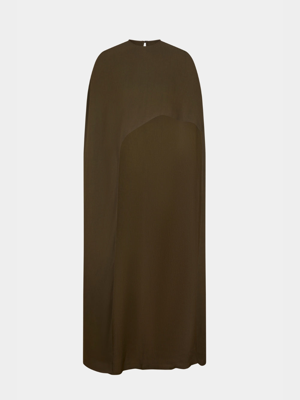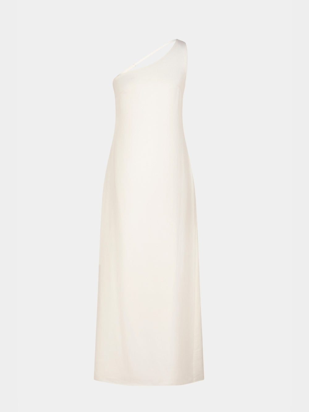 For added definition, the gown is paired with a detachable belt accented by a polished gold buckle, an optional styling element that cinches the waist and introduces a refined contrast to the gown’s understated aesthetic. Worn with or without the belt, the look remains effortlessly elevated.