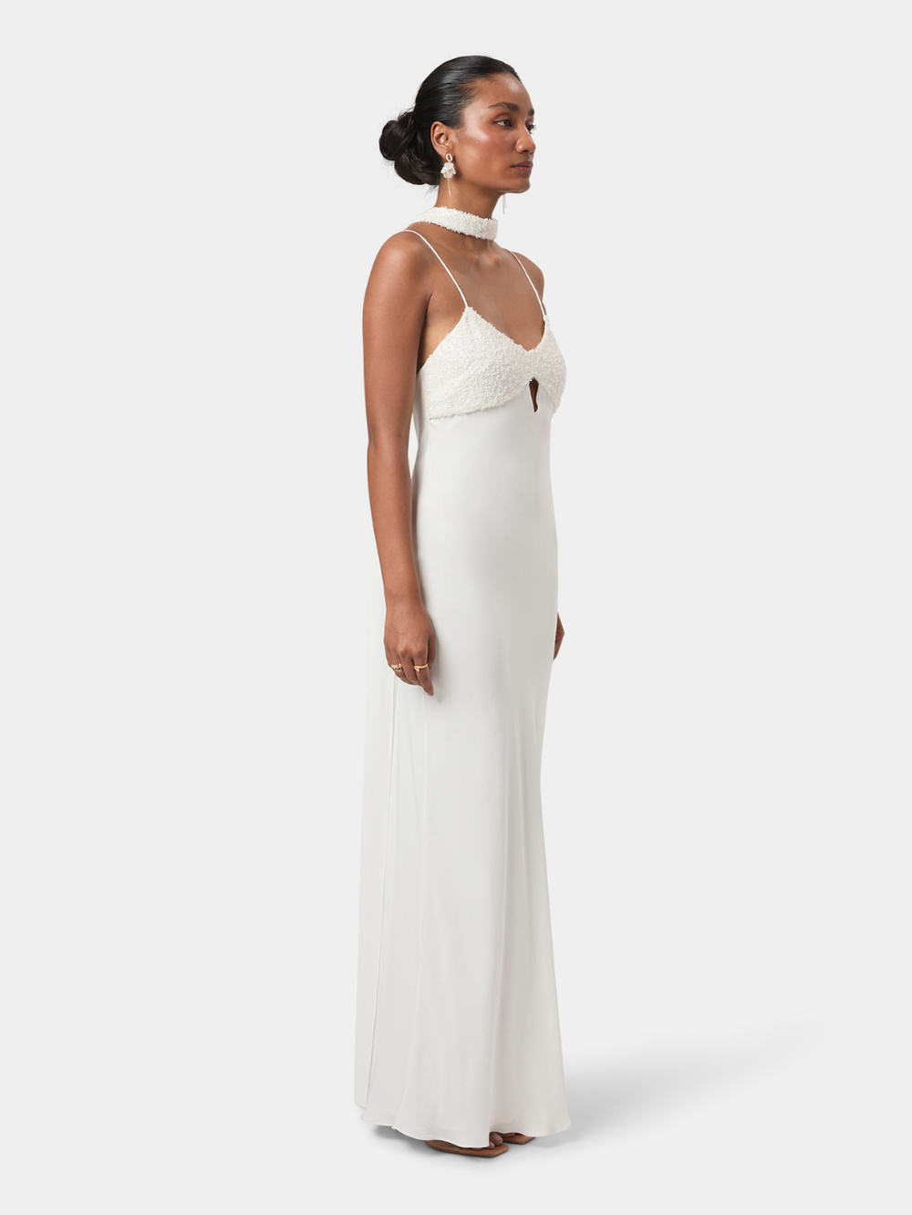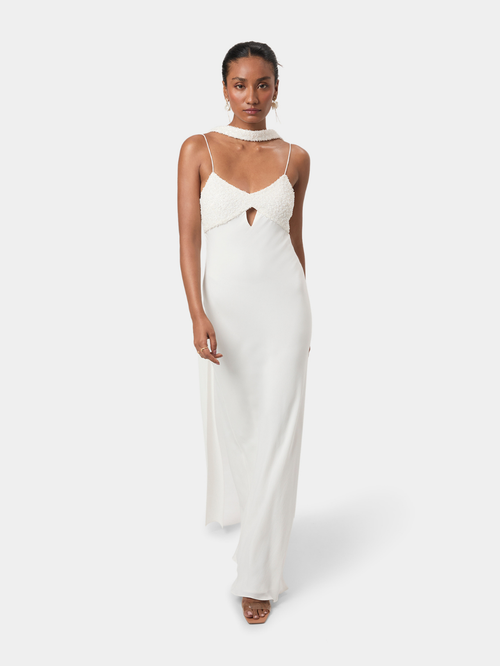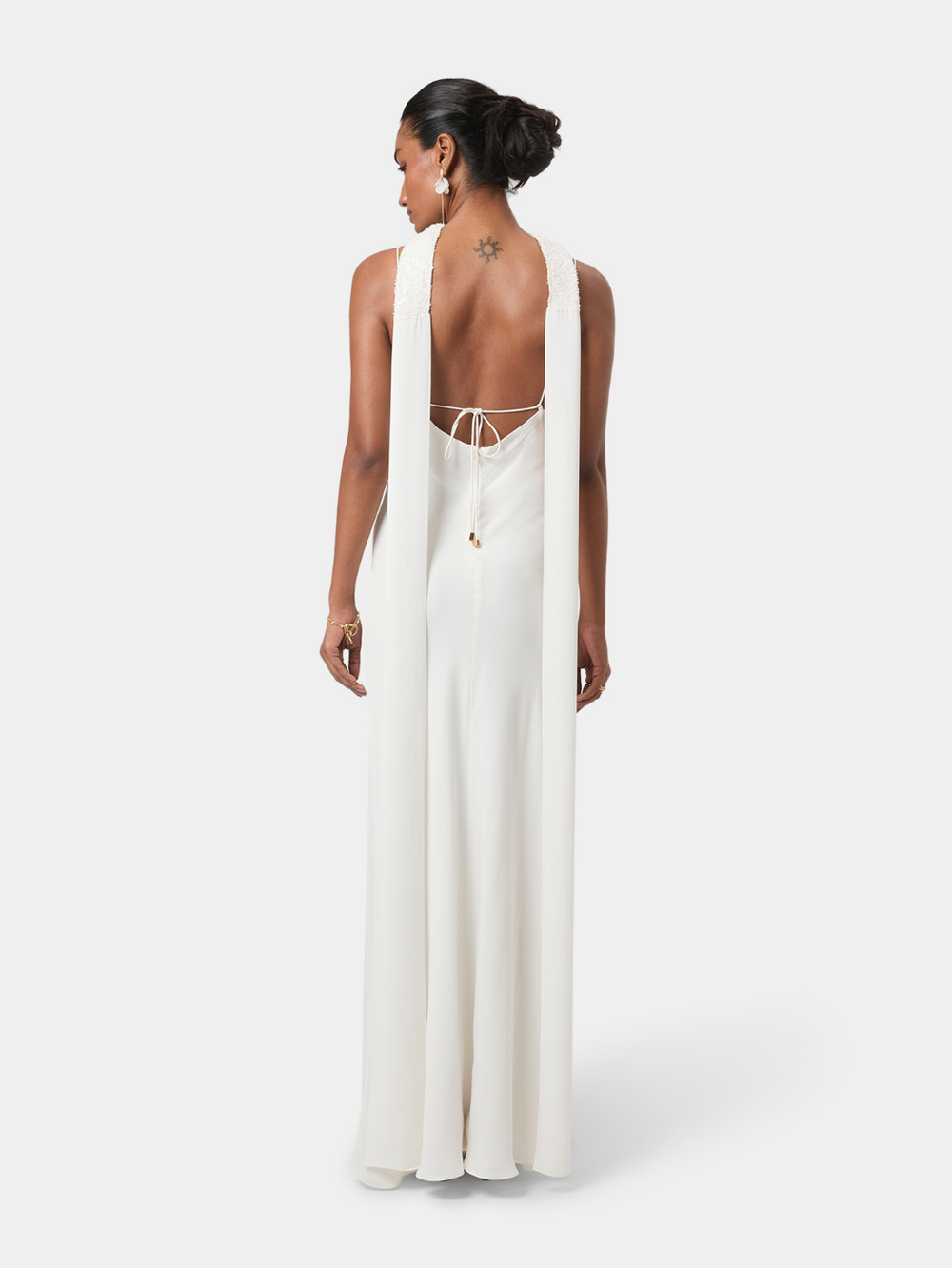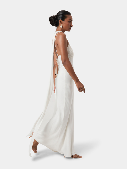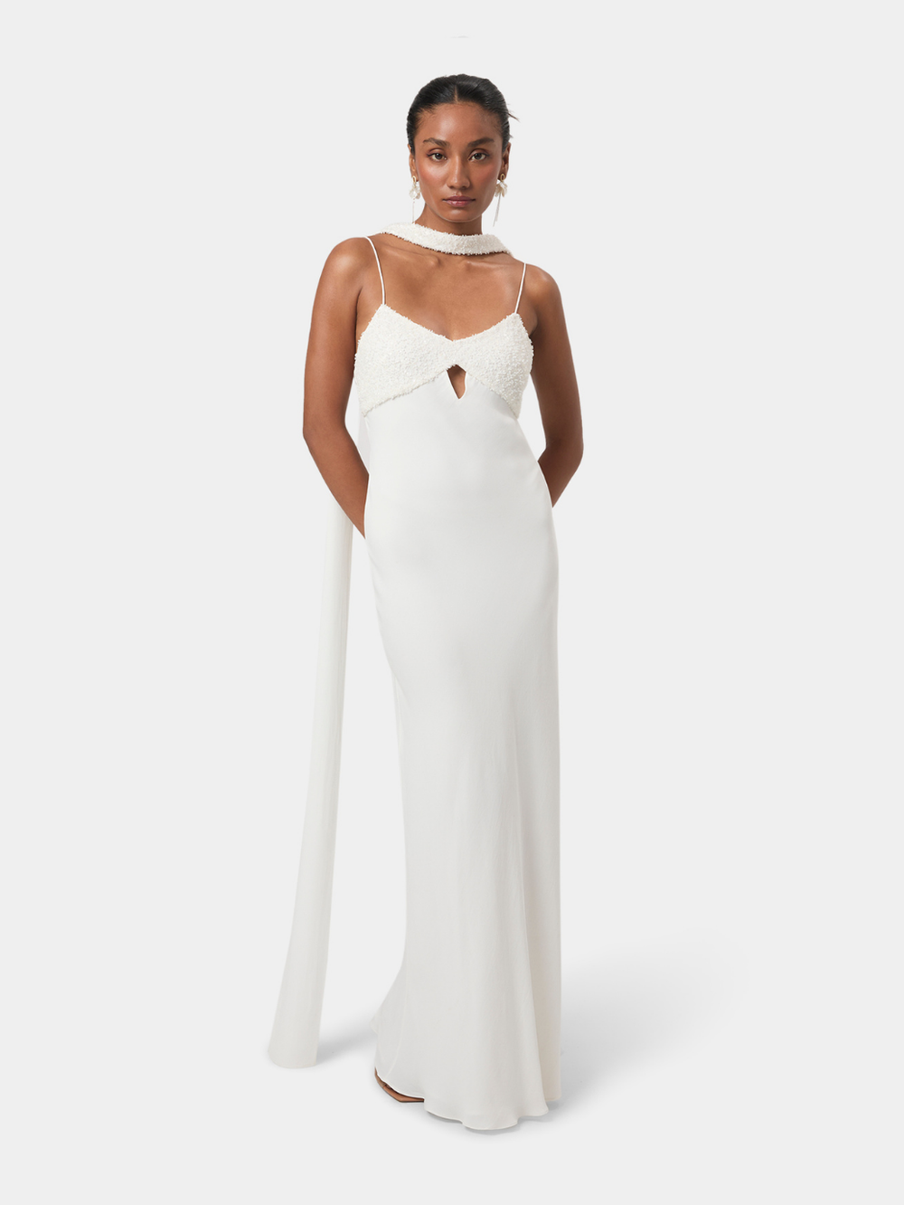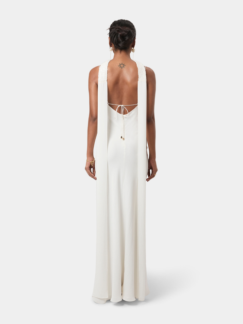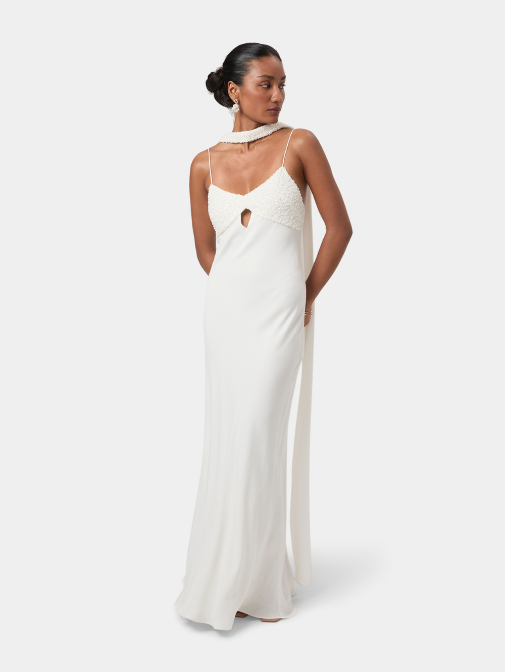 A fluid, floor-length silhouette with delicate sequin detailing embellished across the bodice, this gown balances modern minimalism with soft, textural elegance. Fine straps frame the neckline, while a subtle keyhole adds gentle allure. Long cascading partially embellished scarf panels fall from the shoulders, creating graceful movement, and the open back with adjustable ties ensures an effortless, refined fit.