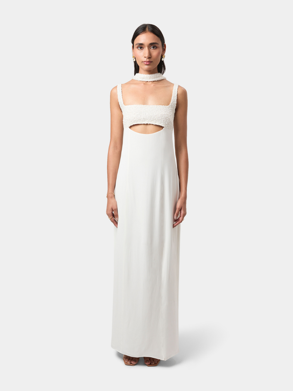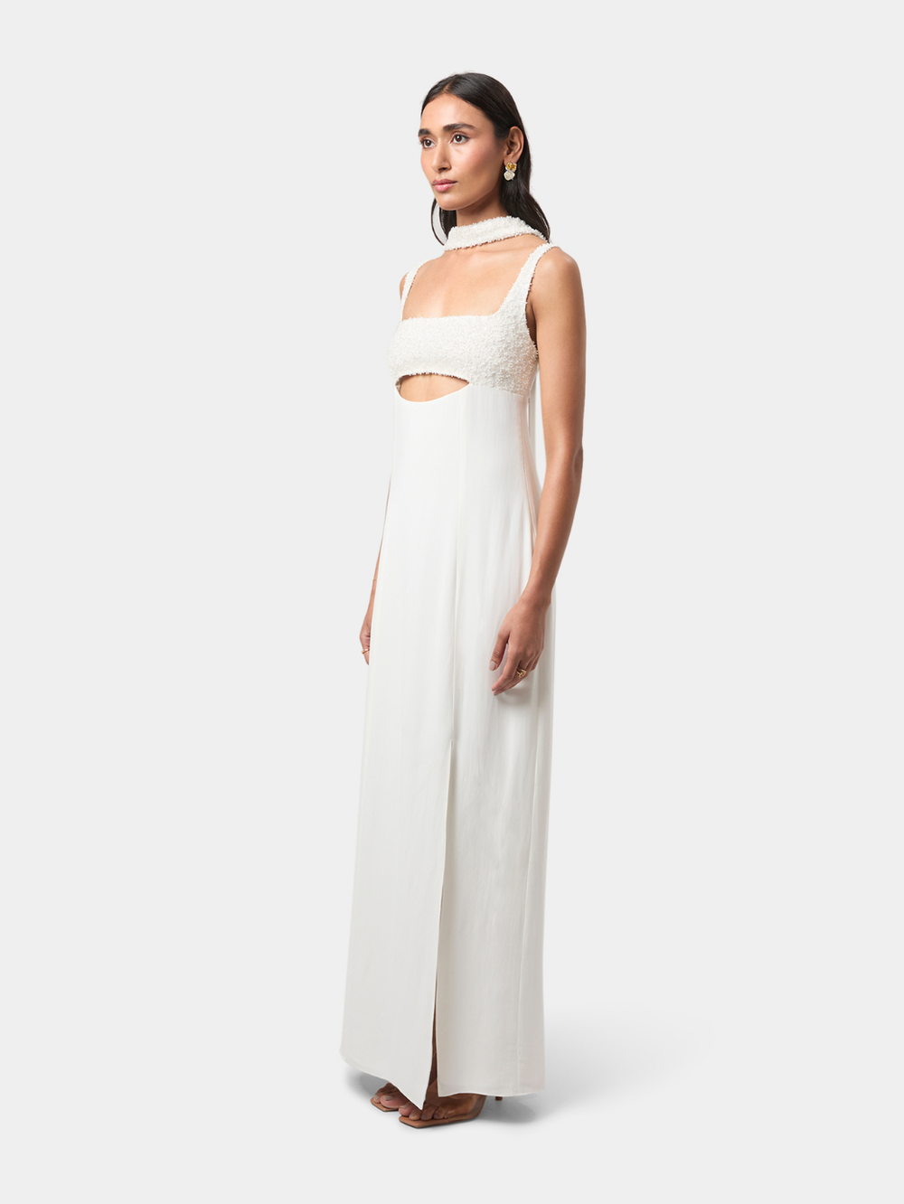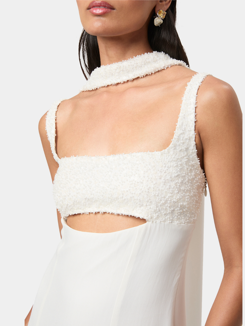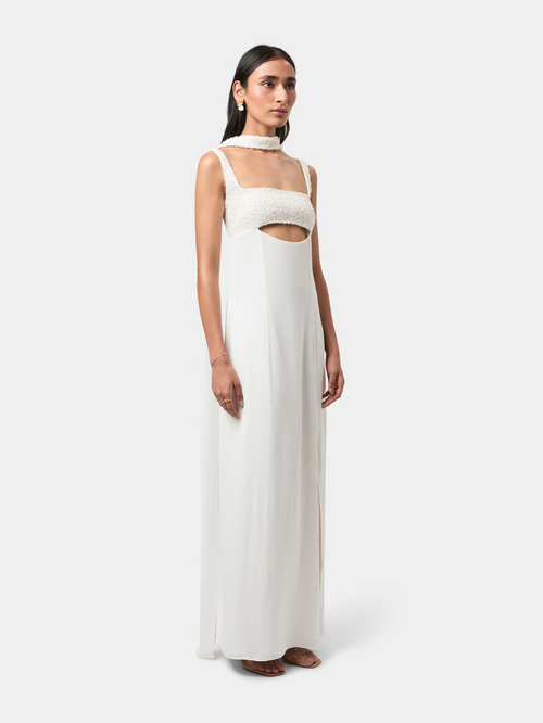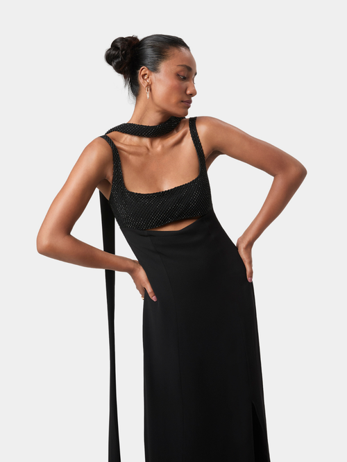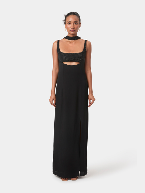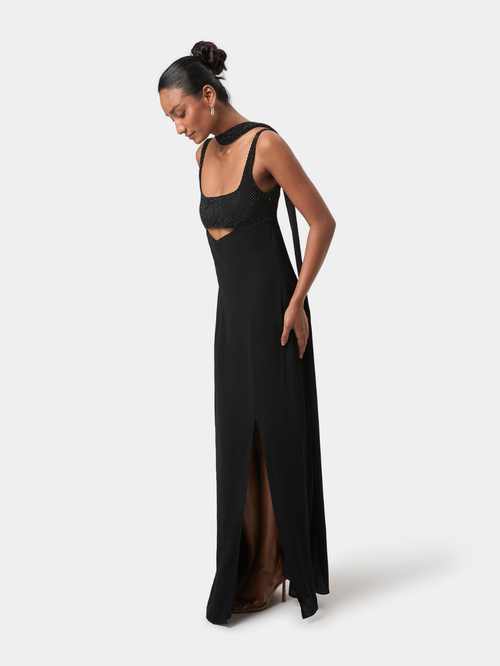 Elise Embellished Gown brings modern sensuality to a clean, elongated silhouette. The intricately embellished bodice creates a soft, tactile texture, framed by a structured square neckline, while a curved cut-out offers a subtle highlight of skin.