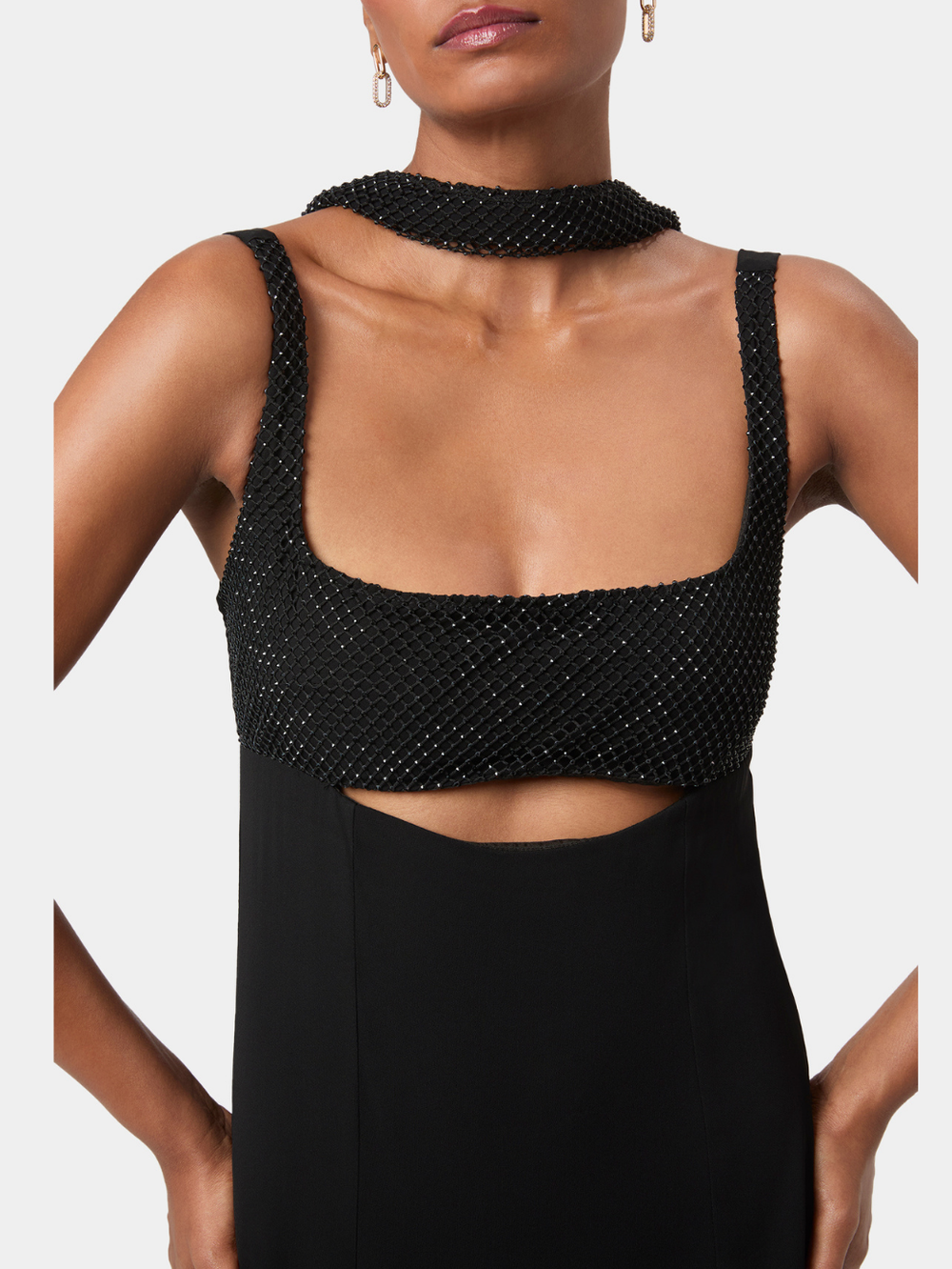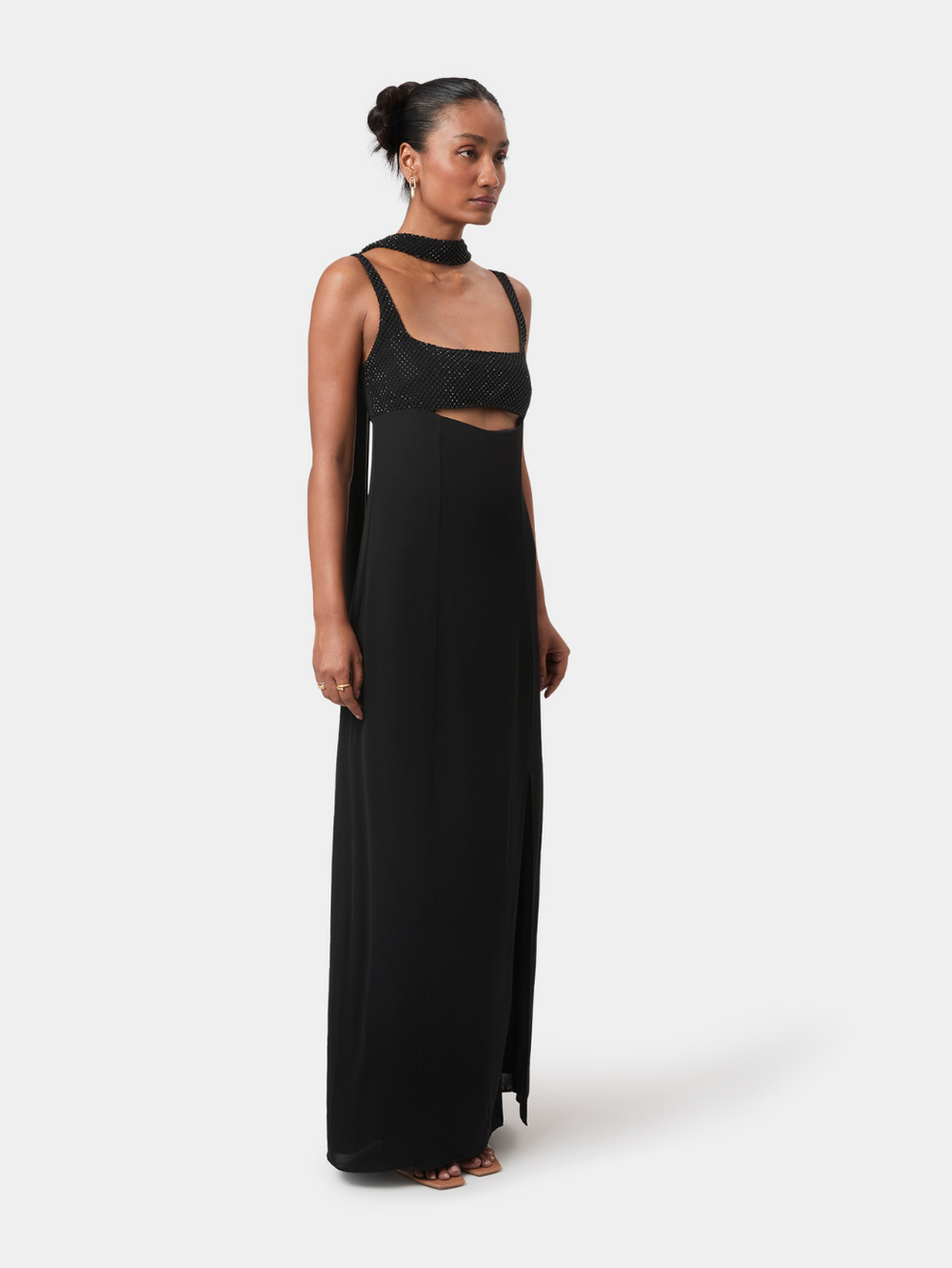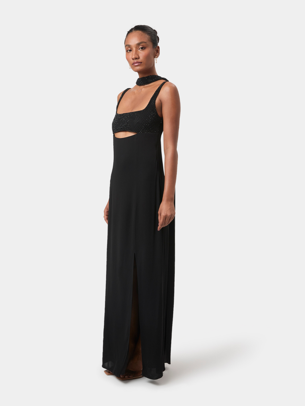 Elise Embellished Gown brings modern sensuality to a clean, elongated silhouette. The intricately embellished bodice creates a soft, tactile texture, framed by a structured square neckline, while a curved cut-out offers a subtle highlight of skin.
