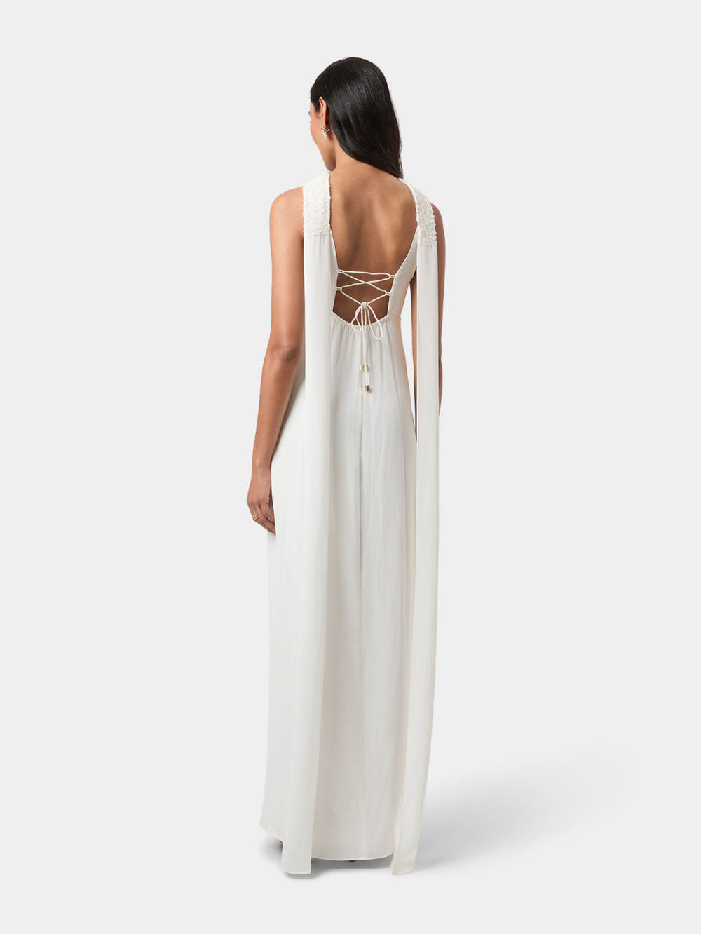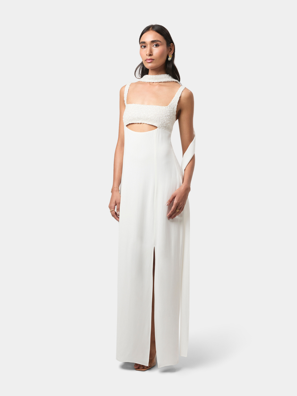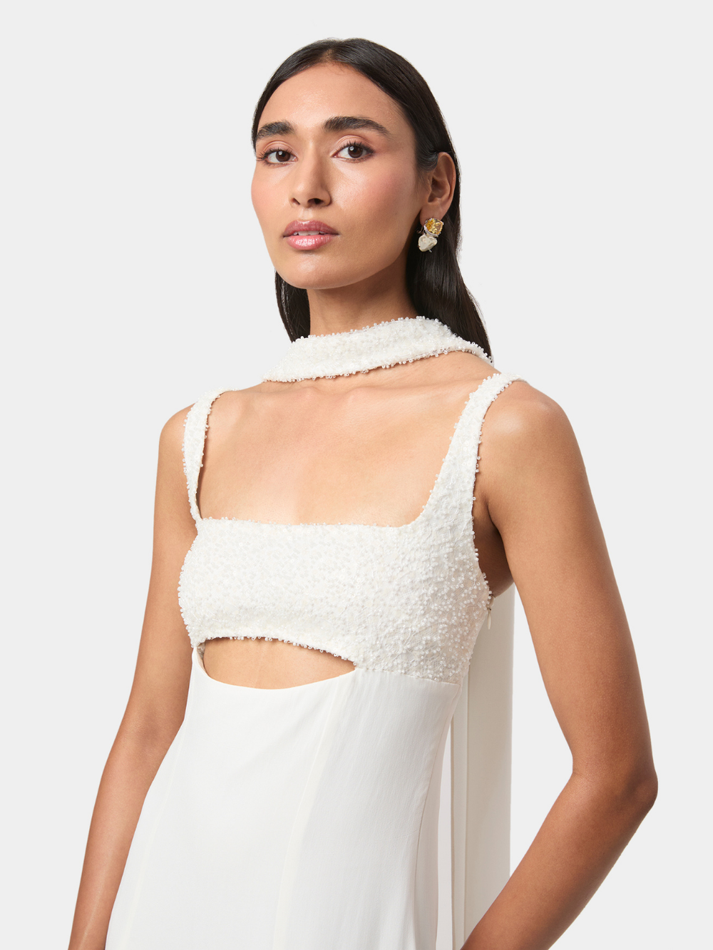 A fluid floor-length scarf drapes from the shoulders, partially embellished to echo the detailing on the bodice. Its cascading fall adds gentle movement and quiet drama, complementing the gown’s minimal, refined aesthetic. Slender back ties provide adjustability and a personalised fit. Elegant and considered, this gown elevates evening dressing through modern lines, thoughtful detail, and graceful flow.