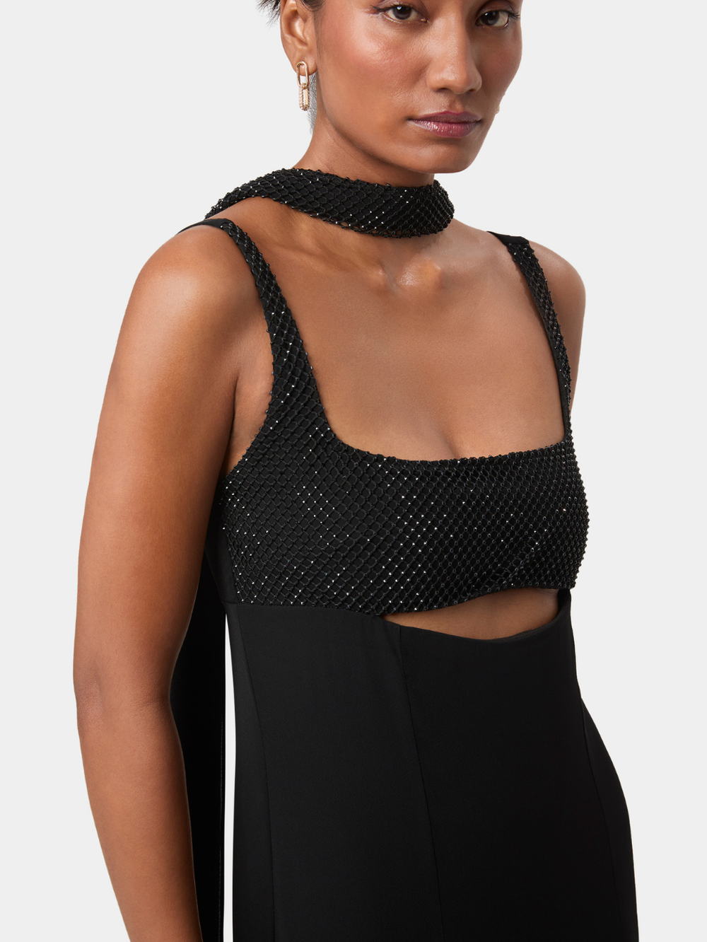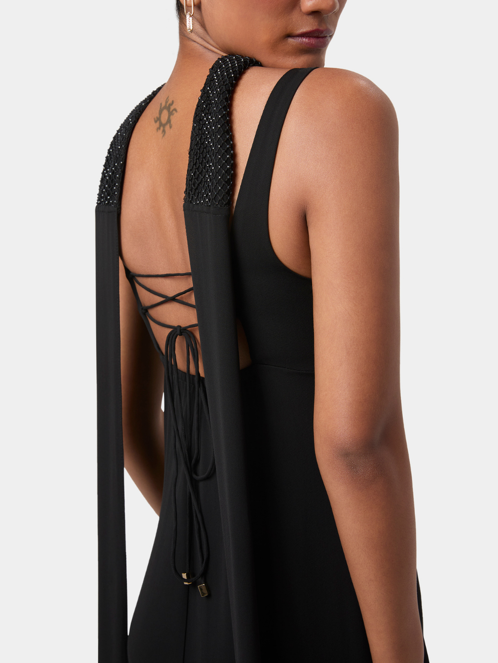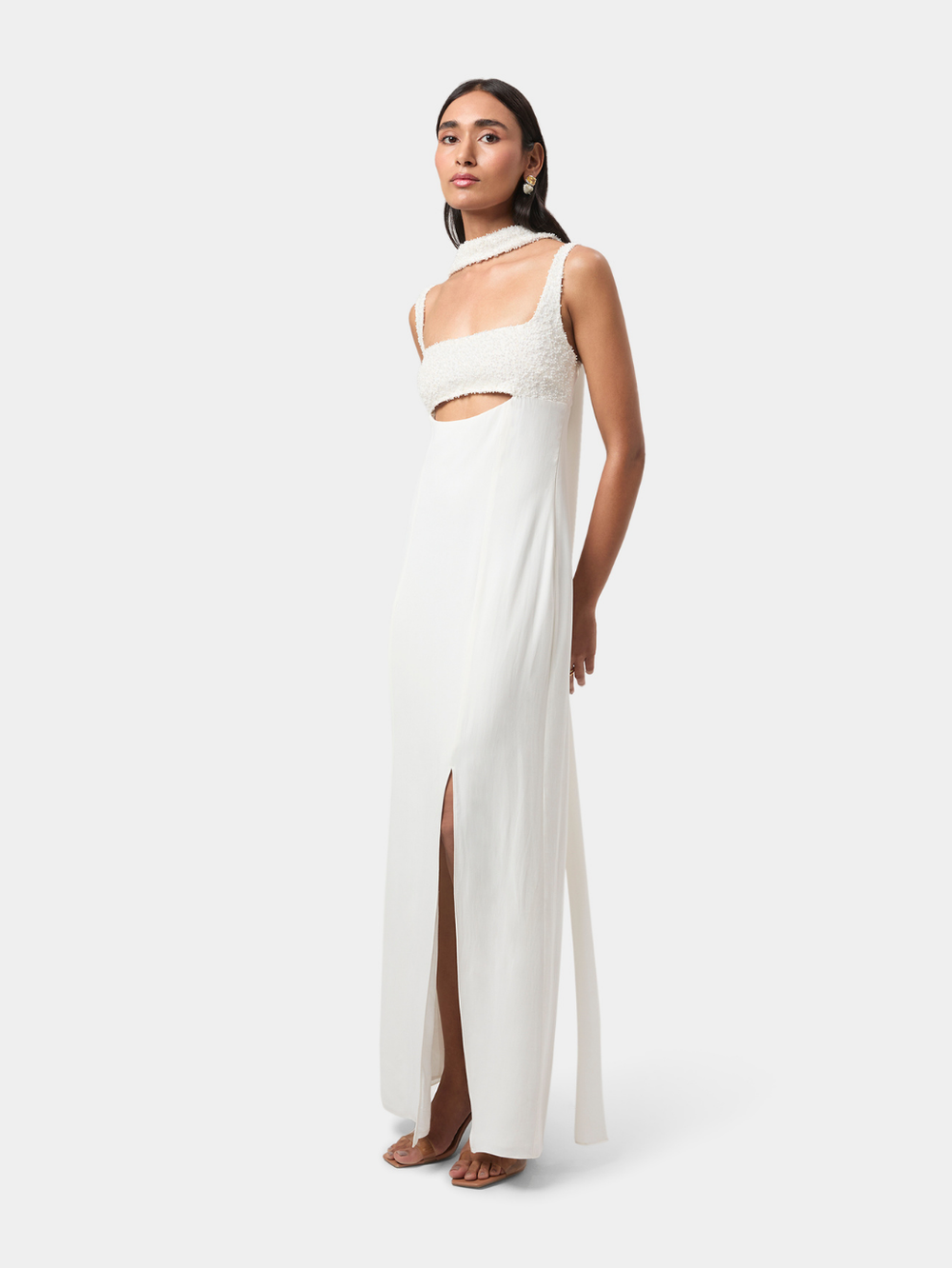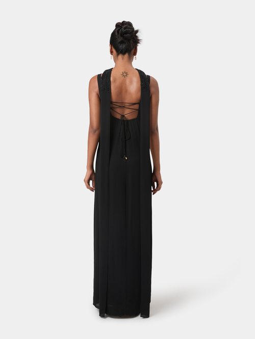 A fluid floor-length scarf drapes from the shoulders, partially embellished to echo the detailing on the bodice. Its cascading fall adds gentle movement and quiet drama, complementing the gown’s minimal, refined aesthetic. Slender back ties provide adjustability and a personalised fit. Elegant and considered, this gown elevates evening dressing through modern lines, thoughtful detail, and graceful flow.