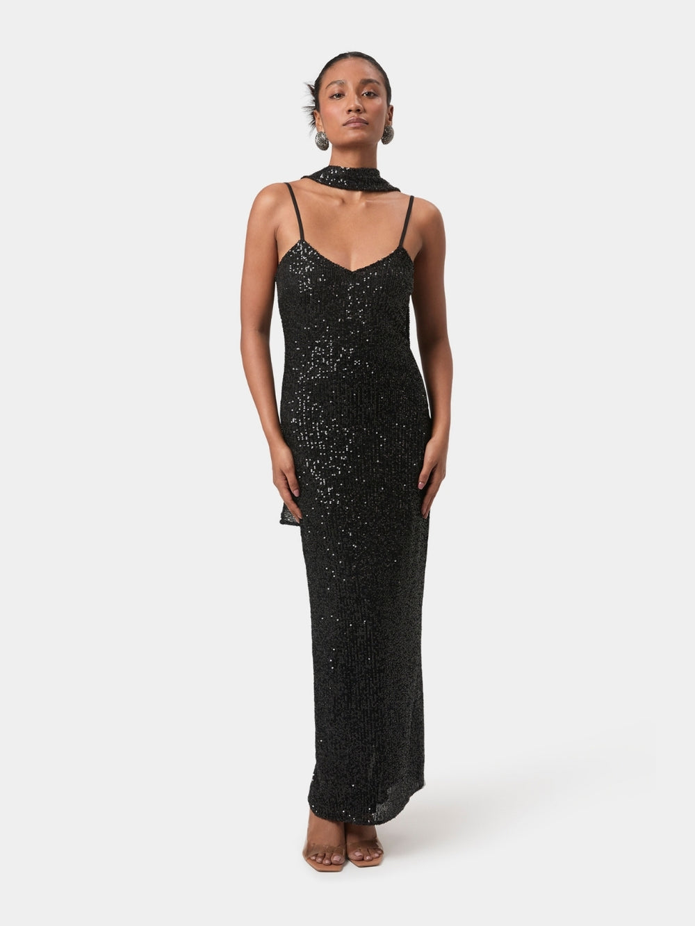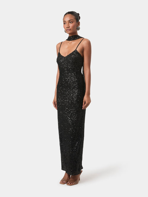 A striking evening piece, cut to a sleek, elongated silhouette and fully adorned with shimmering tonal sequins. Crafted with a gentle stretch, this dress contours the body while remaining effortlessly flattering. A delicate V-neckline, fine straps, and a low back create a refined sensuality, while the draped scarf detail adds unexpected movement while a back slit ensures comfort and ease. Modern, polished, and designed to make an impression