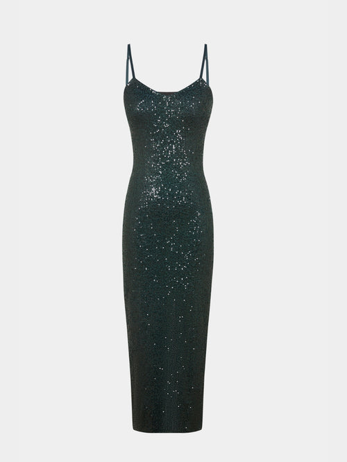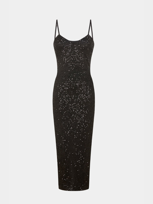 A striking evening piece, cut to a sleek, elongated silhouette and fully adorned with shimmering tonal sequins. Crafted with a gentle stretch, this dress contours the body while remaining effortlessly flattering. A delicate V-neckline, fine straps, and a low back create a refined sensuality, while the draped scarf detail adds unexpected movement while a back slit ensures comfort and ease. Modern, polished, and designed to make an impression