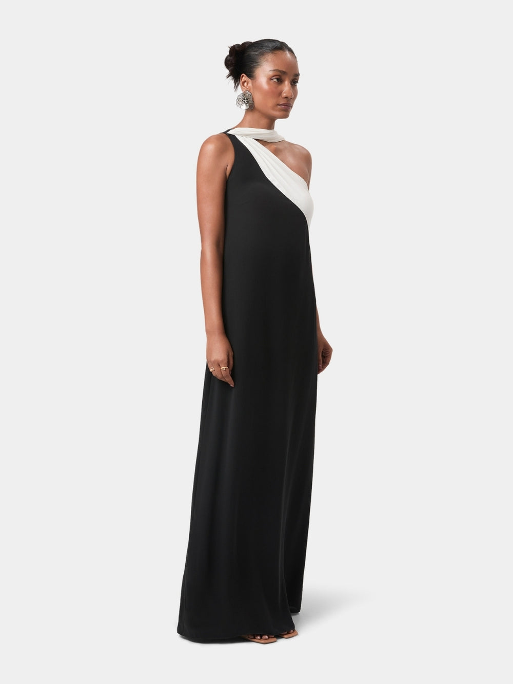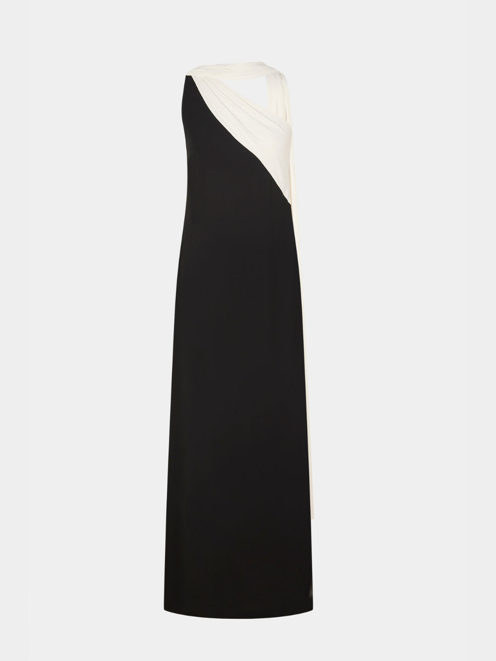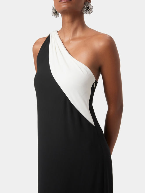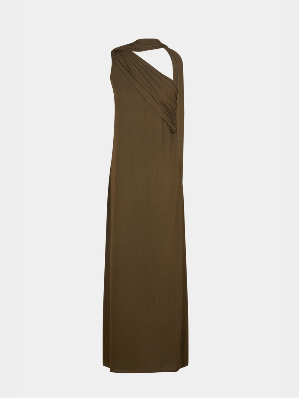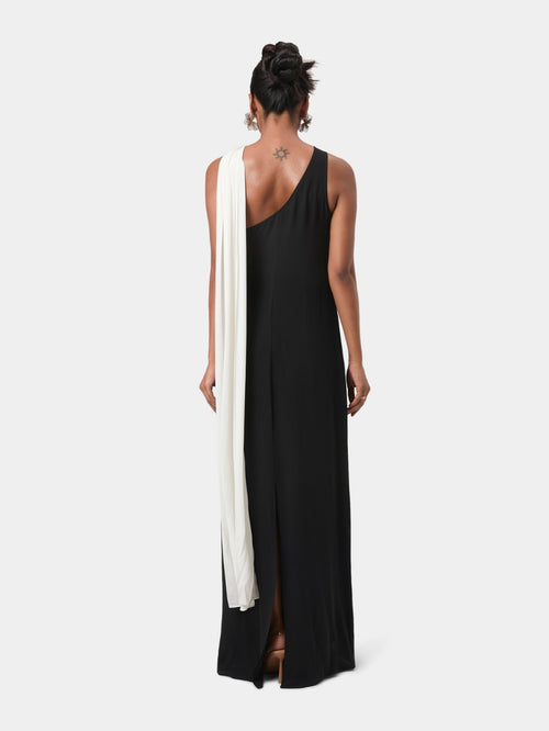 The One Shoulder Draped Gown is defined by its sculpted asymmetric neckline and soft, gathered draping that extends into a fluid, floor-skimming panel. Cut in a lightweight fabric that moves with quiet ease, the silhouette feels both modern and refined, an elegant choice for understated evening wear.