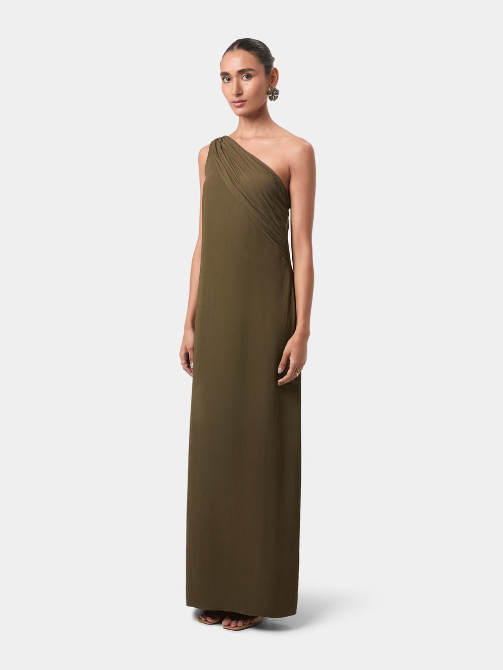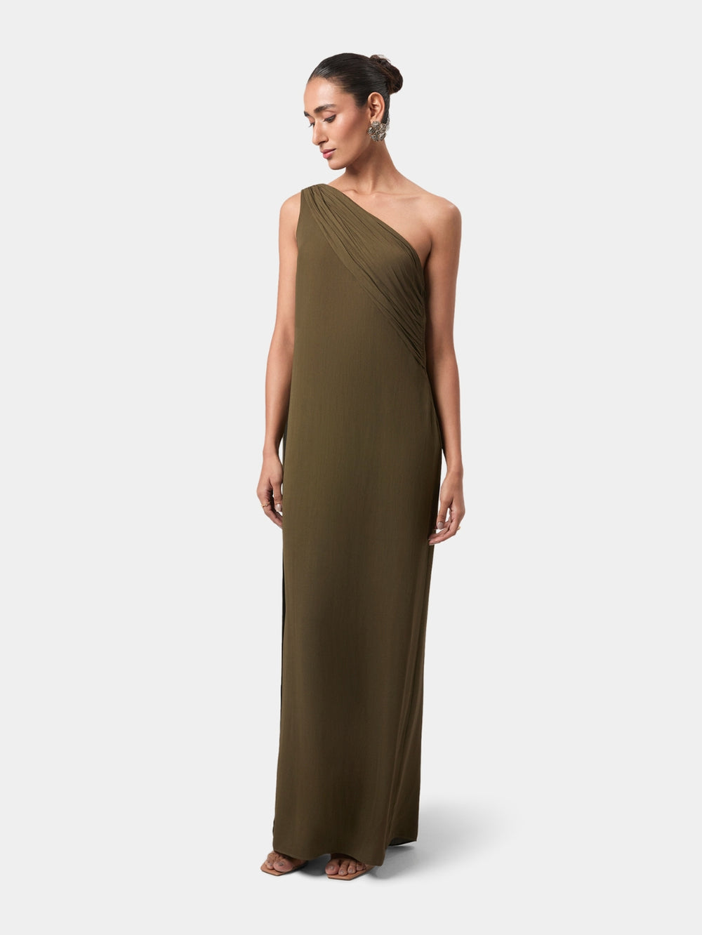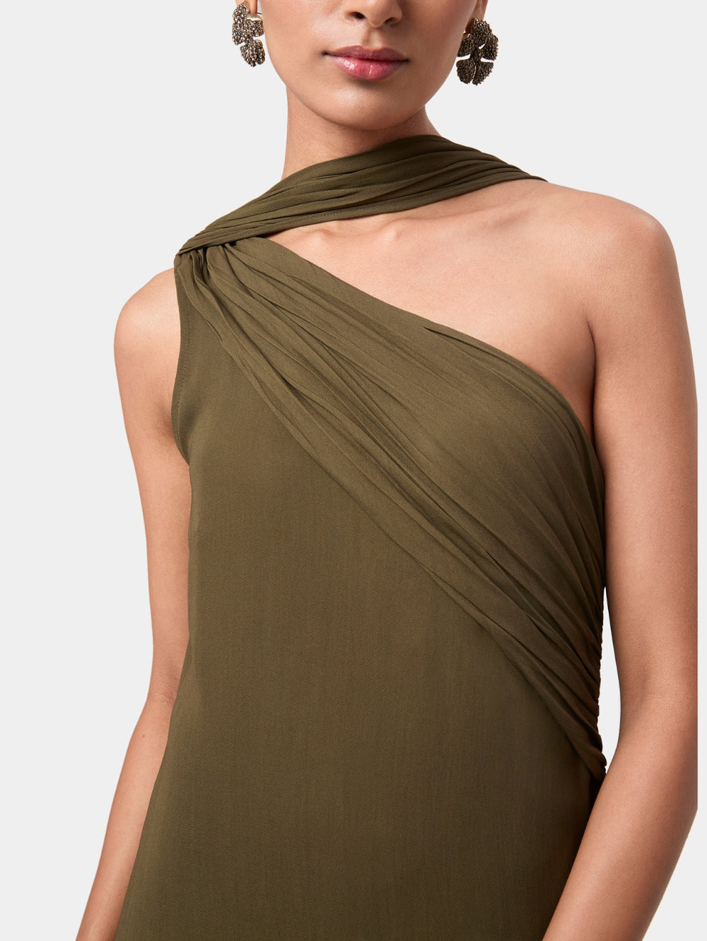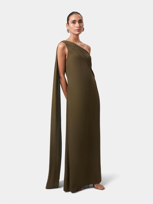 The One Shoulder Draped Gown is defined by its sculpted asymmetric neckline and soft, gathered draping that extends into a fluid, floor-skimming panel. Cut in a lightweight fabric that moves with quiet ease, the silhouette feels both modern and refined, an elegant choice for understated evening wear.