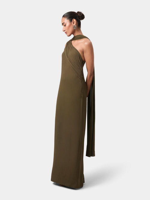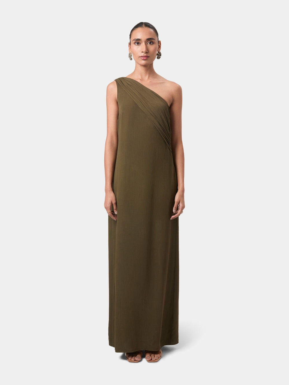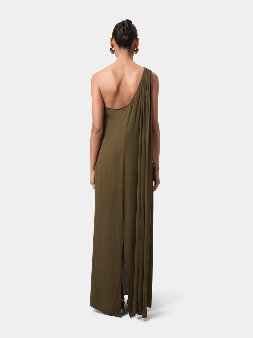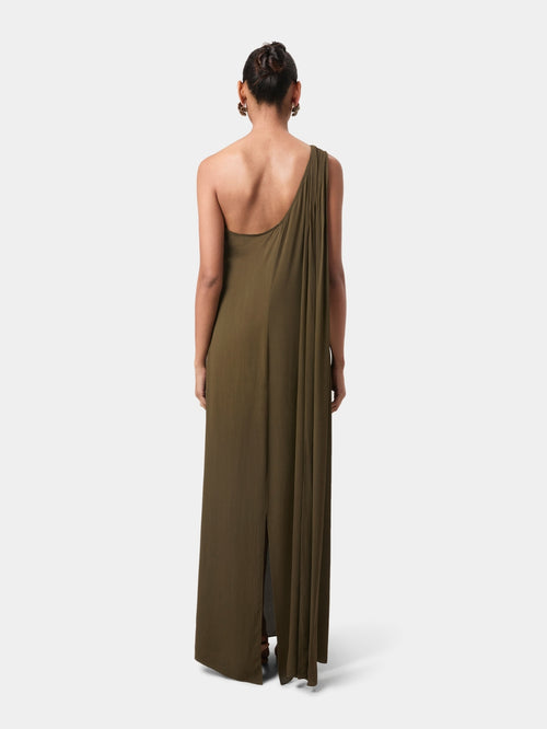 The One Shoulder Draped Gown is defined by its sculpted asymmetric neckline and soft, gathered draping that extends into a fluid, floor-skimming panel. Cut in a lightweight fabric that moves with quiet ease, the silhouette feels both modern and refined, an elegant choice for understated evening wear.