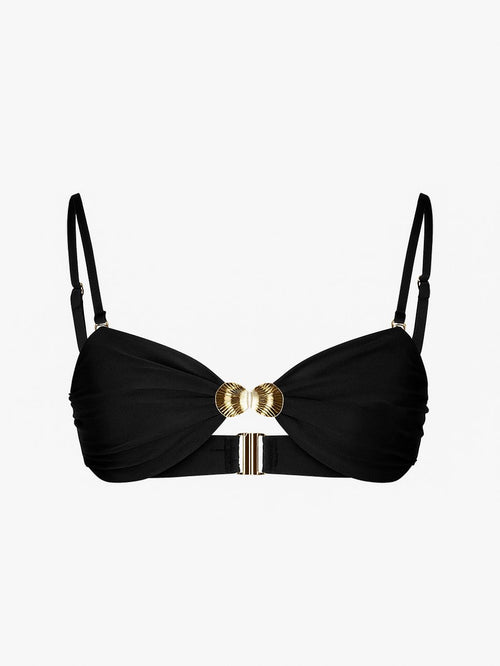 Designed to elevate the classic bandeau with a signature Gold-tone Seashell ring at center front — a subtle nod to the ocean’s natural form. The Scallop Bandeau top features soft ruching and a sculpting fit that enhances your natural shape. With adjustable shoulder straps for versatile styling and a secure back clasp, it offers both comfort and support. The fully lined interior includes a discreet slit for optional padding, allowing for customisable coverage.