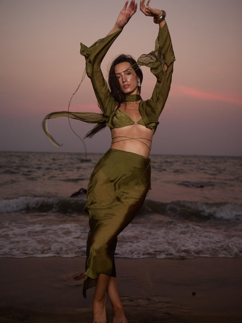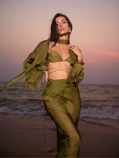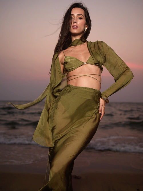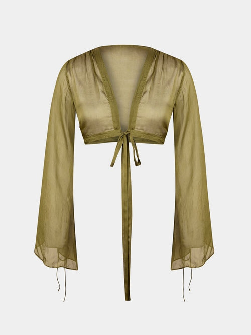 Cut from featherweight sheer fabric, it offers subtle structure with relaxed tailoring and endless styling potential. Designed to be worn open, tied at the front, or layered loosely over swim and evening separates, it transitions effortlessly from beachside ease to balmy after-hours.
